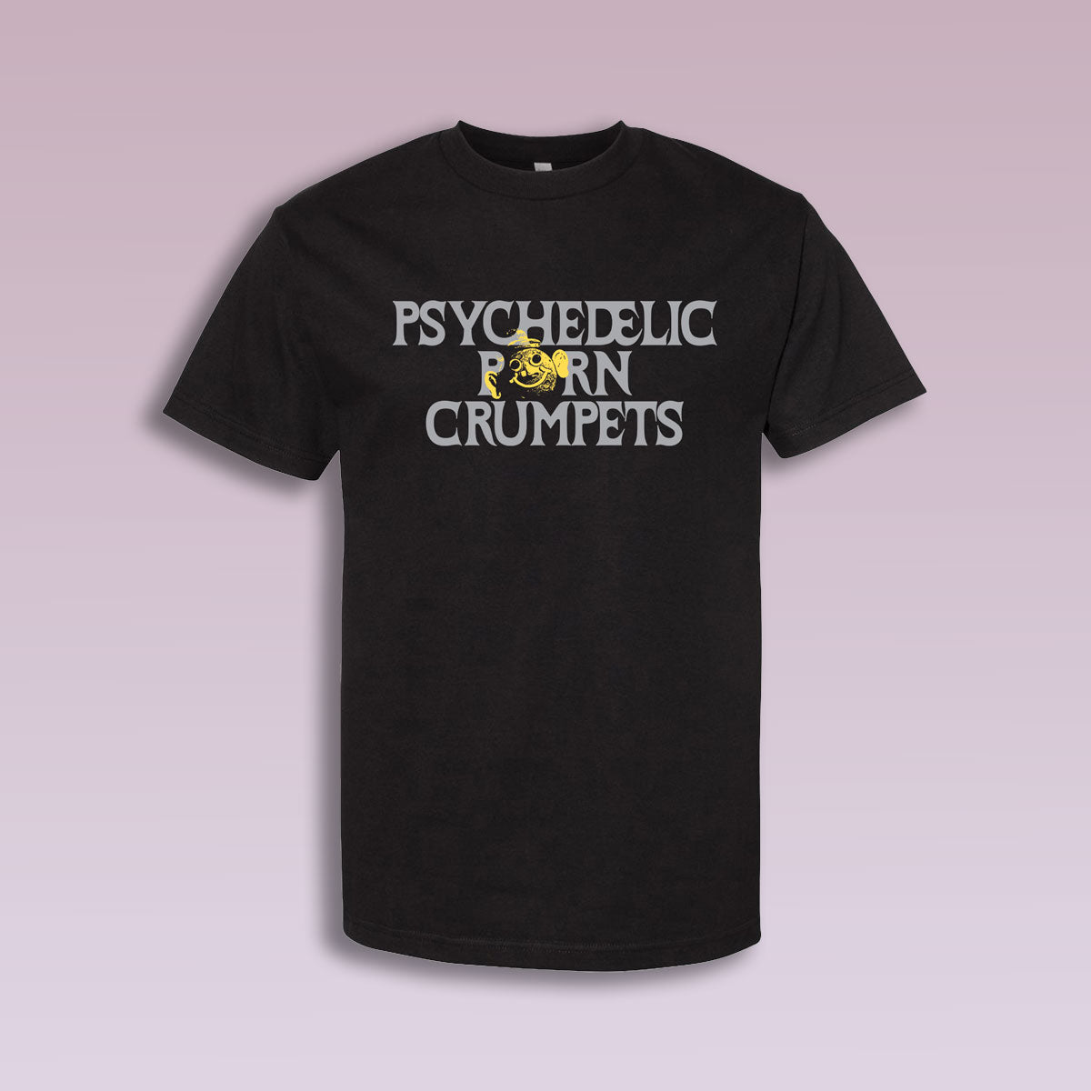 Unisex T-Shirt in black featuring Psychedelic Porn Crumpets "Moonman" artwork printed on the front & back.